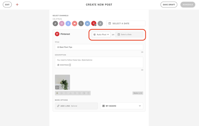 - Select Pinterest from the icons at the top, upload your media, choose the board you want to pin to, and add your caption, hashtags, etc.